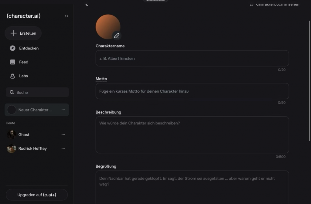 Abb.3: Screenshot aus der Charaktererstellung bei Character.ai, 15.03.2026, 18:32 Uhr, https://character.ai/